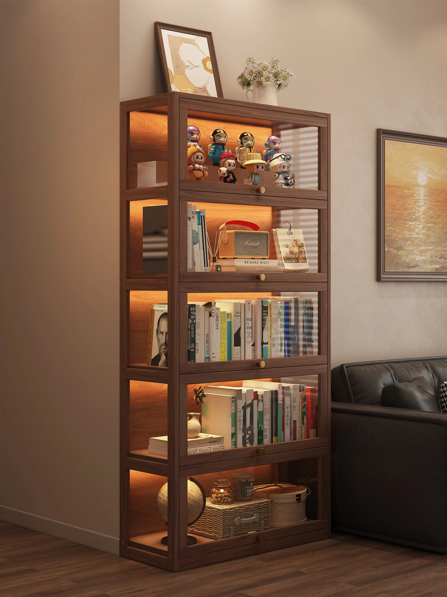 Solid Wood Bookshelf with Dustproof Design and LED Lights - Vintage Style Display Cabinet for Collectibles, Floor-standing Storage Shelf, Wall-mounted Bookcase