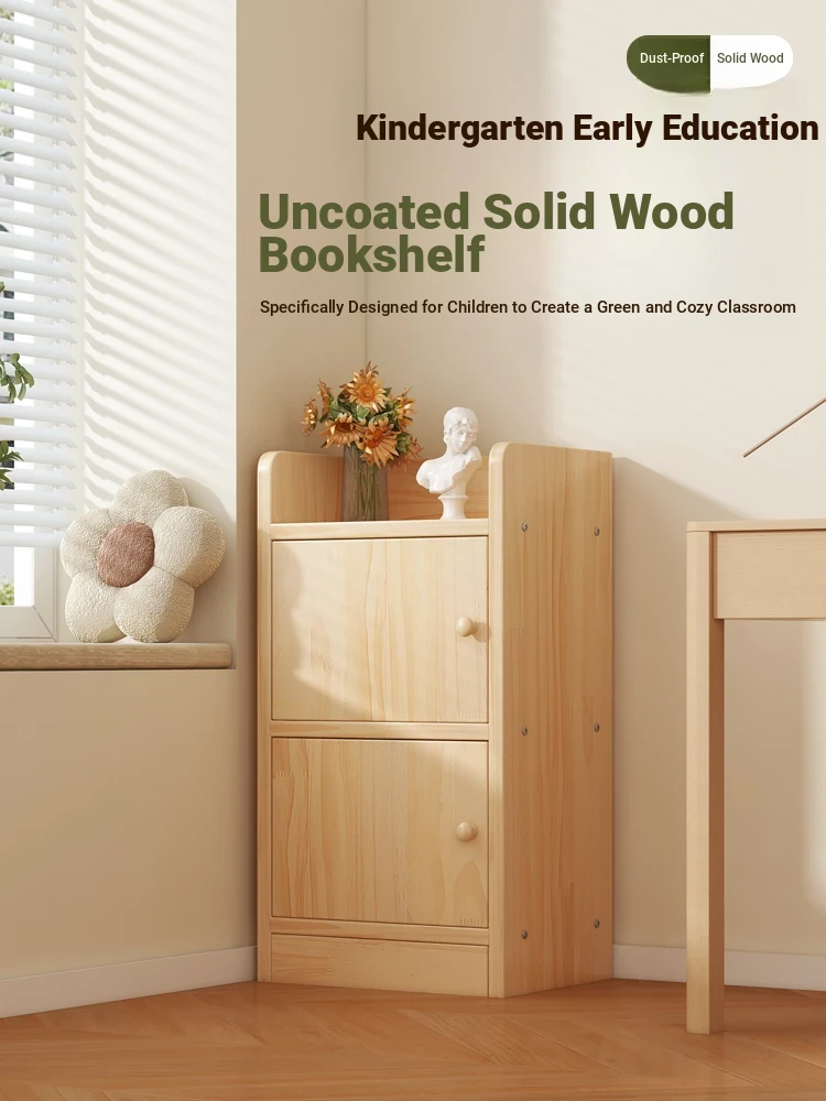 Narrow Wooden Bookshelf with Doors for Kindergarten - Space-Saving Children's Reading Corner Wall Cabinet