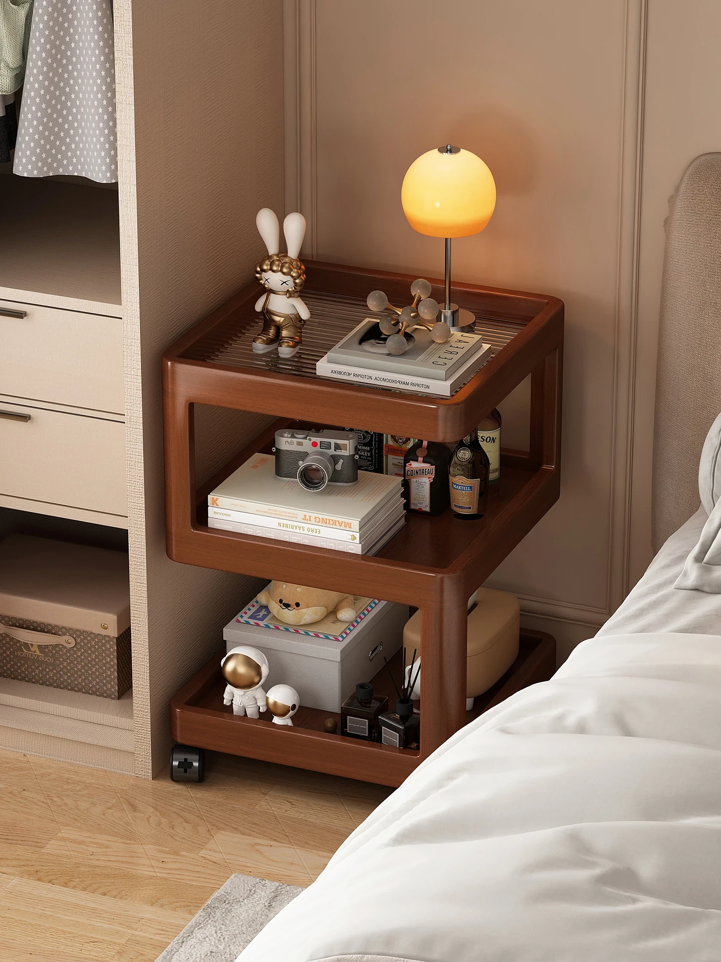 シンプルな無垢材のベッドサイドテーブル、壁にぴったりフィットするコーナー収納キャビネット、中華風のレトロデザインで、家庭用の寝室に最適な小さなサイドテーブルです。収納力抜群で、スタイリッシュな空間を演出!