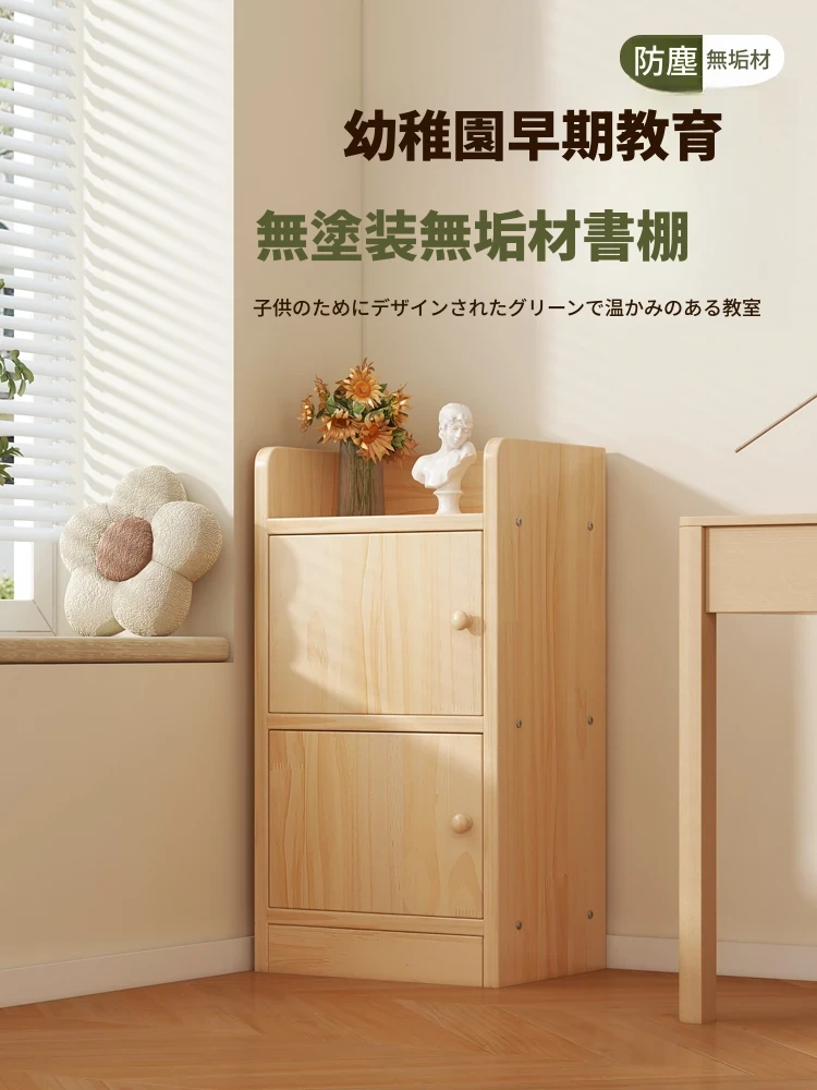 狭いスペースにぴったり!扉付きの子供用本棚 - 幼稚園向け実木製、読書エリアを整えるスタイリッシュなデザイン。壁際に設置可能で、場所を取らずに本をすっきり収納!