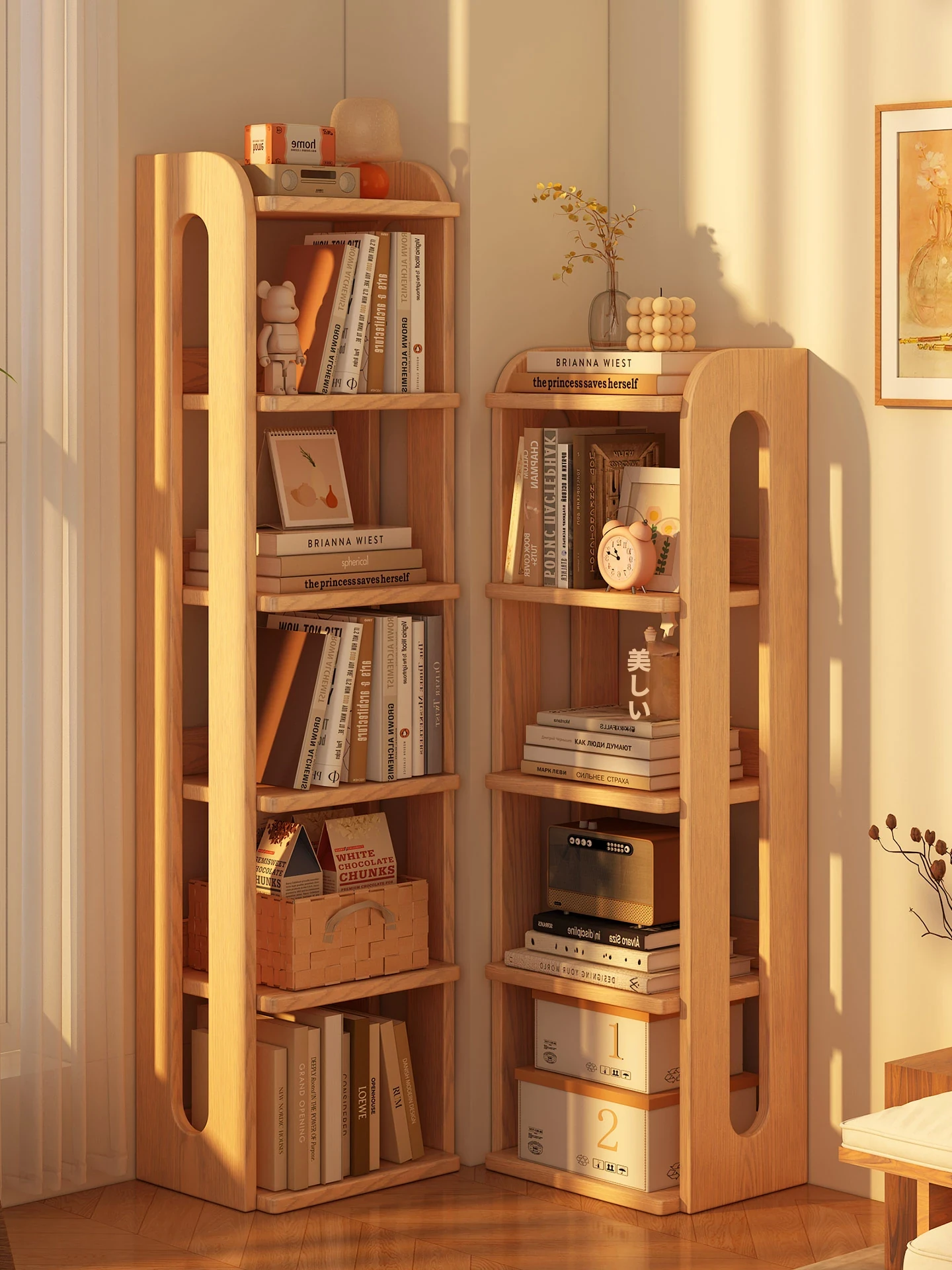 シンプルなフロア書棚 - 壁掛け式コーナー収納、リビングや子供部屋に最適!絵本や本をすっきり収納できる天然木製のスタイリッシュな書棚です。学生や家庭にぴったりの使いやすいデザイン!