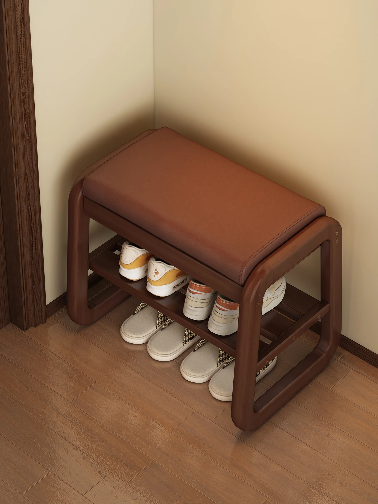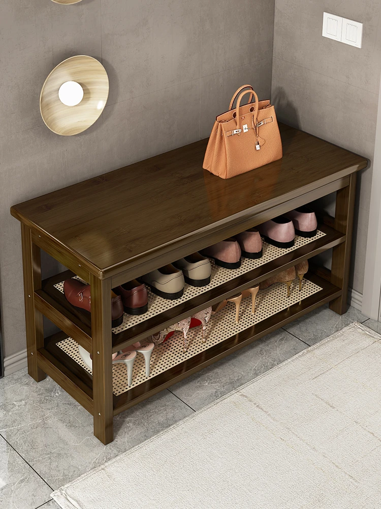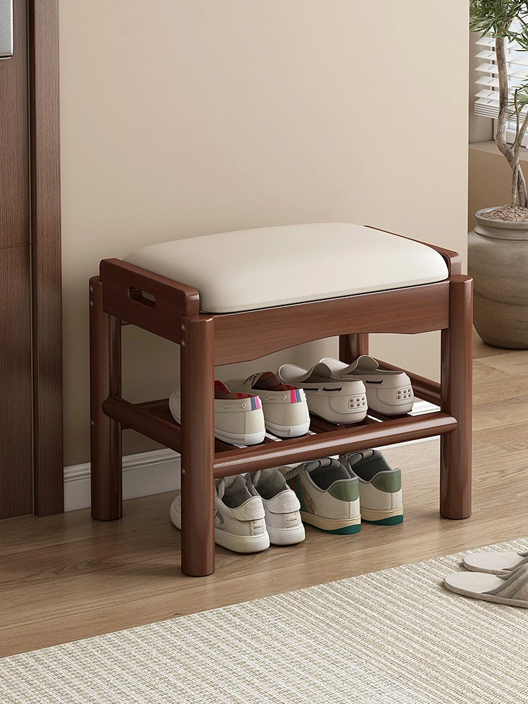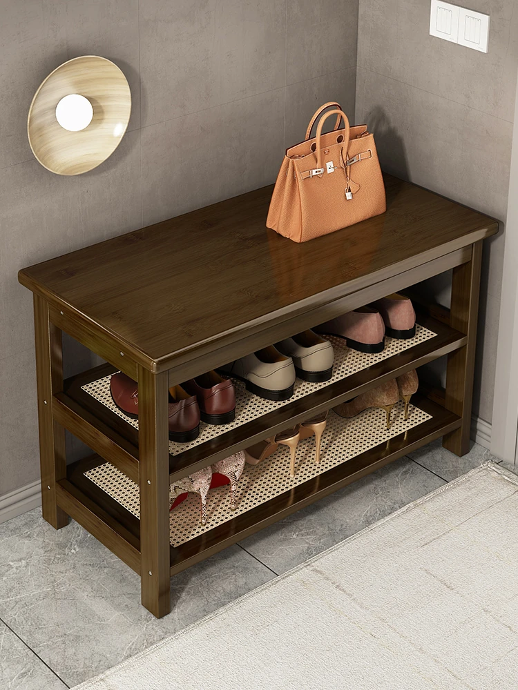 省スペースの実木製シューズベンチ!レトロデザインの玄関用スツール一体型シューズキャビネット - 寝室やベッドサイドに最適、快適な靴履き体験を提供します!