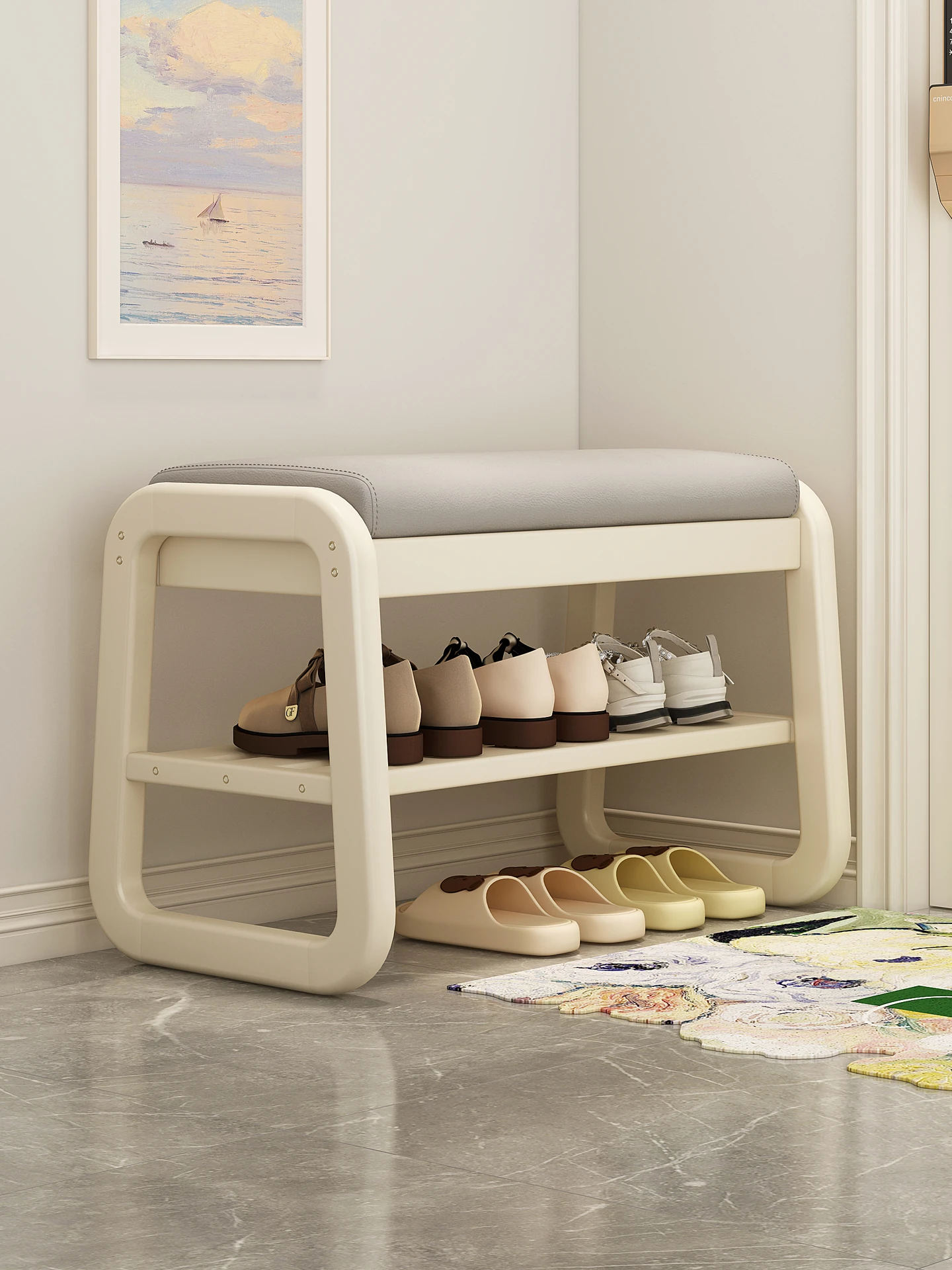 おしゃれな無垢材シューズベンチ - スリムなデザインで玄関にぴったり!収納機能付きで、靴を履く時も便利。クリーム色の優しい風合いが、試着室や家のどこでも使えます。快適さとセンスを兼ね備えたアイテムです!