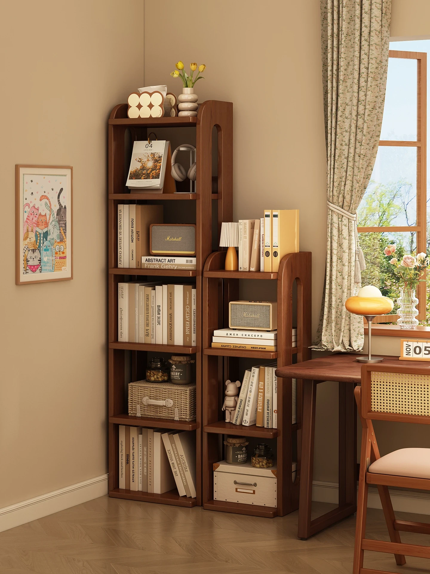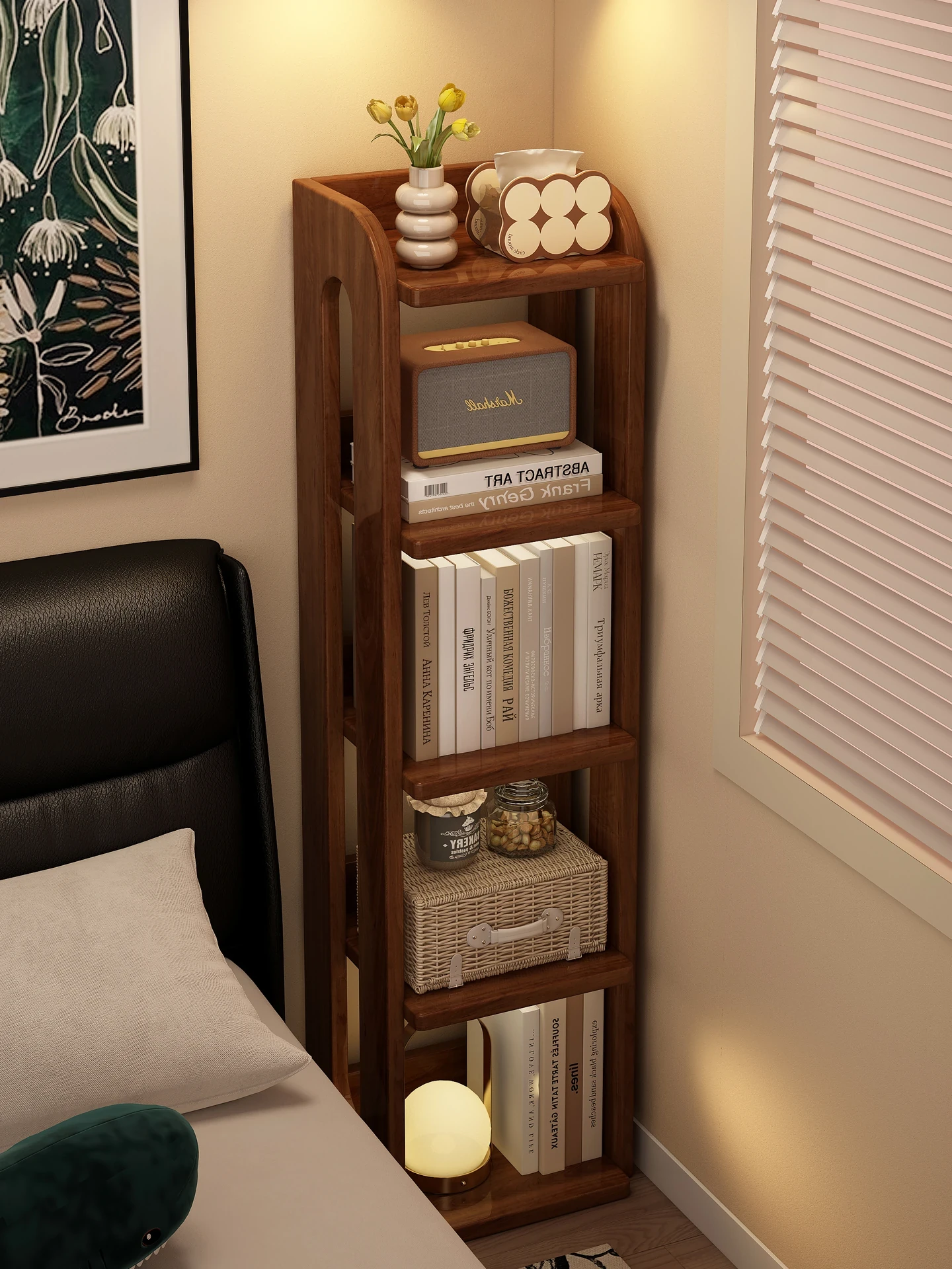 無垢材のフロアブックシェルフ - ベッドサイドや角にぴったりなスリムな収納ラック!リビングや寝室に最適な多層シンプルキャビネットで、スタイリッシュに空間を活用しませんか?
